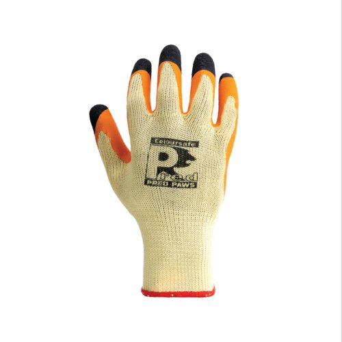 Pred Paws Cut B Safety Gloves have a polycotton liner, crinkle latex coating with double dipped finger tips and a coloured cuff size indicator. Supplied as 1 pair.
