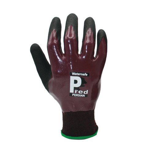 Pred Persian Watersafe Cut 1 Safety Gloves has a 15 gauge black nylon liner and is fully coated in smooth latex with a sandy nitrile palm coating. Features a coloured cuff size indicator. Supplied as 1 pair.